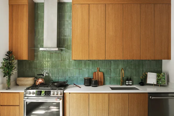 The parlor floor unfolds into an expansive open plan with soaring high ceilings and wide-plank white oak floors. A striking staircase and custom iron railings frame the space, while natural light flows across the living and dining areas. The chef’s kitchen is a true centerpiece, finished with quartz countertops, custom oak cabinetry, a large island with seating, and Café stainless steel appliances. Handcrafted green glazed tile adds texture and depth to the backsplash, setting a refined contrast against warm wood tones. Sliding glass doors open to a private balcony with views of a landscaped garden, seamlessly connecting indoor and outdoor living. The second floor offers two full ensuite bedrooms, each thoughtfully designed with generous closet space and spa-like baths featuring natural stone, custom vanities, and polished fixtures. The top floor, crowned by a skylight, is filled with natural light and includes two oversized bedrooms, two full baths and a substantial laundry room to enhance convenience.