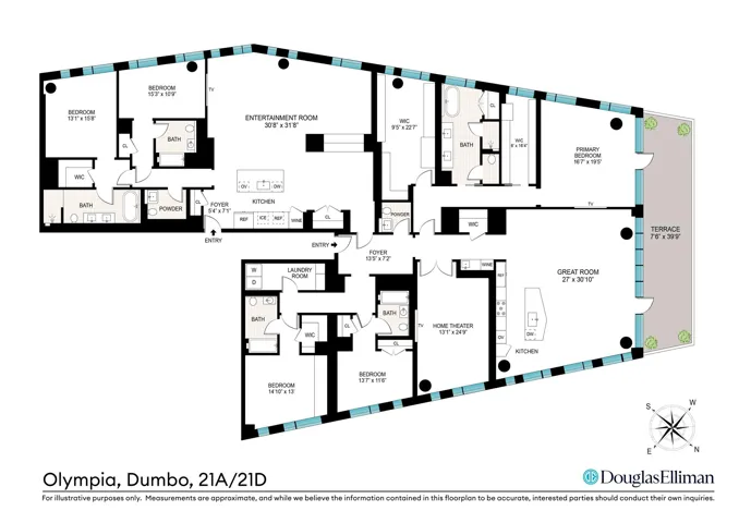 Set high above the city in Dumbo’s most exclusive new development, Residence 21A/D at Olympia is an ultra-luxurious sanctuary spanning 5,261 SF (312 SM) of flawless design, with an expansive 322 SF (29.9 SM) wraparound terrace offering breathtaking 180-degree views of the Manhattan skyline, New York Harbor, and the Statue of Liberty.
