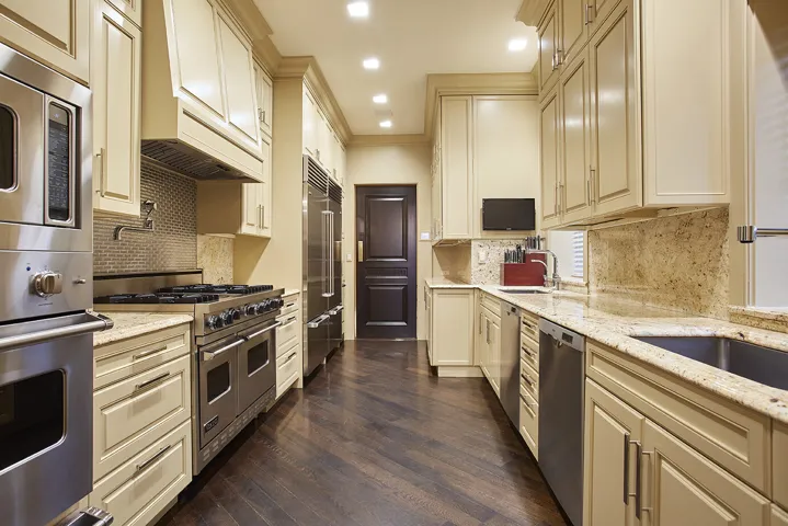 Enter into a spectacular foyer and entry gallery with a grand central stair with brass and iron balustrade and, marble floors which lead to a guest powder room and the formal dining room. The adjacent chef’s kitchen is outfitted with appliances worthy of a fine restaurant, including an eight-burner Viking range, multiple ovens, dual Sub-Zero refrigerators, and two Bosch dishwashers. A pantry and breakfast bar lead to an outdoor terrace.