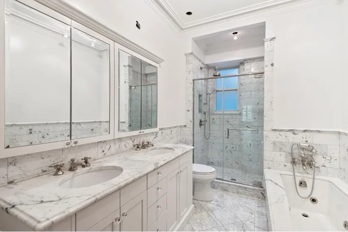 Stunning views into Central Park from the expansive and stunning living room, library, formal dining room, and master bedroom. The entry foyer is a grand entry to this stunning 4 bedroom plus 5th bedroom or home office/maid’s room with 4 full bathrooms and 2 half baths. The prewar details are a perfect back drop to both classic or modern furnishings and art. The windowed kitchen is spacious, can accommodate a full size dining table, and includes Sub-Zero refrigerator, Viking Stove, and stone counters. 11″ ceilings, beautiful crown moldings, and two decorative fireplaces.