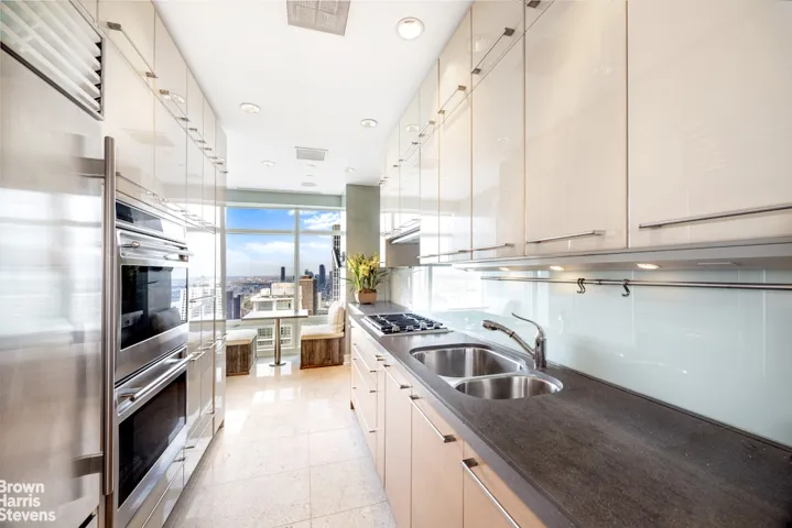 The Poggenpohl-designed chef’s kitchen is equally impressive, featuring a windowed breakfast nook with commanding city and East River views. Finishes include Basaltina stone countertops, Pannafragola granite flooring, sleek cabinetry, dry wine storage, and top-tier appliances by Wolf, Sub-Zero, and Miele.