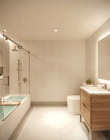 Introducing Residence 403 at The Ainsley, a spacious and sophisticated 2-bedroom, 2-bathroom home that combines modern luxury with outdoor living. Spanning 868 square feet, this residence features a generous layout and private outdoor space, making it perfect for both entertaining and everyday living. The expansive open-plan living and dining area boasts wide plank white oak floors and large windows that flood the space with natural light. Sliding glass doors open onto a private terrace, creating a seamless transition between indoor and outdoor living. The chef’s kitchen is designed with functionality and elegance in mind, featuring imported Italian cabinetry from Scavolini, Taj Mahal quartzite countertops, and an Ilve Majestic induction range with brass trim imported from Italy, including a panel-ready refrigerator and dishwasher. The combination of sleek surfaces and top-tier appliances ensures that the kitchen is both a culinary haven and a stylish centerpiece of the home. The king-size primary bedroom offers abundant space, natural light, and a walk-in closet. The en-suite bathroom is designed with relaxation in mind, featuring chrome fixtures, a custom Ocala Walnut scalloped vanity topped with Calacatta Miraggio, and luxurious Vive tiles imported from Spain. The second bedroom is versatile, ideal for use as a guest room, home office, or family space, and is conveniently located near the second full bathroom, which mirrors the high-end finishes of the primary bath. A full-size washer/dryer is tucked away for ultimate convenience. The Ainsley offers a curated lifestyle with access to over 10,000 square feet of luxurious amenities, including a fitness center, a children’s playroom, a residents’ lounge, and a rooftop terrace with panoramic views of Brooklyn and beyond. Located in the vibrant neighborhood of Park Slope, this home is moments from Prospect Park, boutique shopping, gourmet dining, and several subway lines for an easy commute. Deeded parking is available for purchase, making life at The Ainsley both convenient and luxurious.