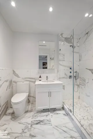 The windowed chef’s kitchen is a showpiece with honed Taj Mahal stone counters and backsplash, custom Shaker cabinetry, and a full suite of Viking appliances. The adjacent dedicated office enjoys its own full bath, ideal for flexible guest use. South facing rooms are bathed in sunlight, while white oak strip floors run throughout, tying the layout together with warmth and character. A stacked washer and dryer are tucked away for convenience.