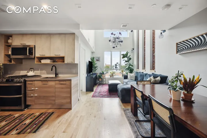 Top-floor duplex in a boutique 2017 building, offering soaring double-height ceilings and a rare deeded corner roof deck with sweeping skyline views.