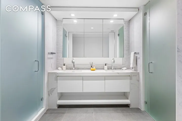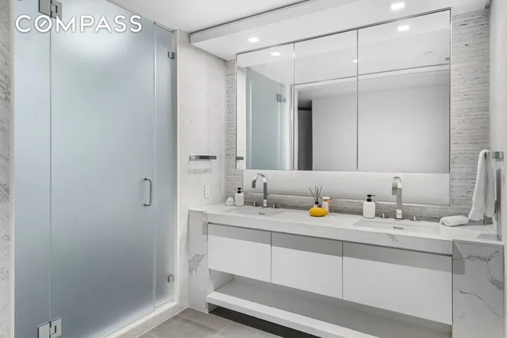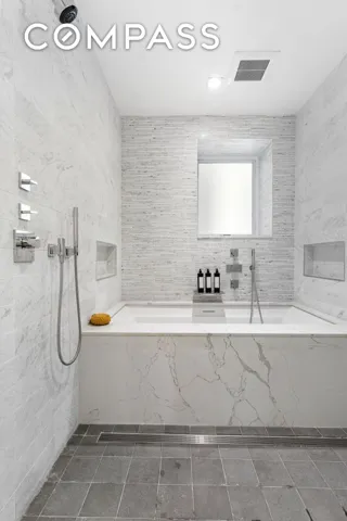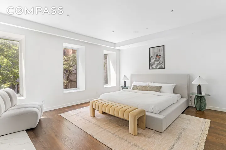 On the fifth floor, there are two more bedrooms, both featuring spacious terraces. One terrace faces south, while the other has a large wraparound area to the north, offering stunning views of the Midtown skyline and the Chrysler Building. The northern bedroom boasts a lovely corner position with plenty of windows. Both bedrooms on this floor share a full bathroom with a window.