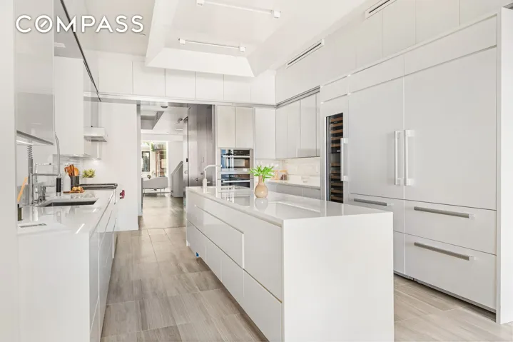As you ascend to the parlor floor, the impressive layout becomes clear, showcasing a magnificent main floor ideal for hosting guests and serving as the heart of the home. The south-facing living room boasts a custom floor-to-ceiling fireplace and a striking corner bay window that offers views of the surrounding architecture. The spacious dining room sits between the living room and a large, dream eat-in kitchen, which features custom white lacquer cabinets and all the modern conveniences you would expect. These include Dornbracht fixtures, a vented Wolf 6-Burner range with a griddle, Miele ovens with a warming drawer, a double-paneled Sub-Zero refrigerator and freezer, and a separate full-sized wine fridge.