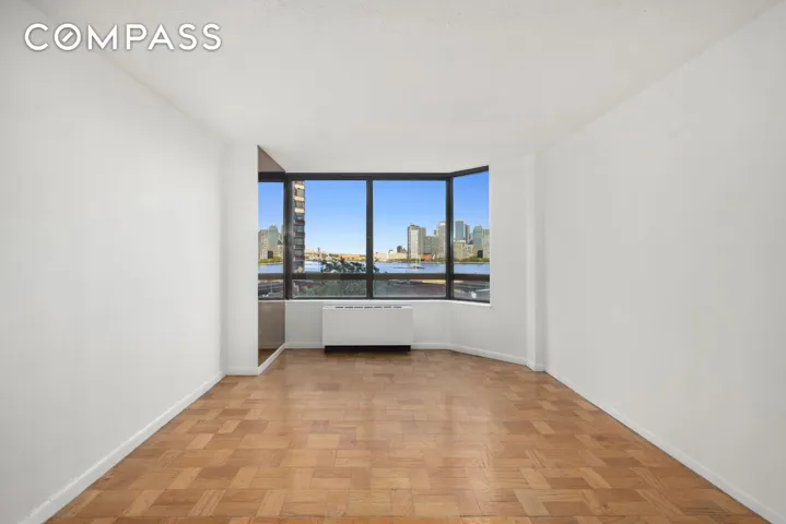 This spacious one-bedroom, one-bath residence offers unobstructed views of the East River framed by wall-to-wall windows that bathe the interiors in natural light. The entry foyer opens into a flexible living and dining area with generous closet space, complemented by a galley kitchen and an updated marble bath. The king-sized bedroom provides exceptional storage, and a temporary wall currently creates a second bedroom option. With low carrying costs, this home presents a rare investment opportunity.
