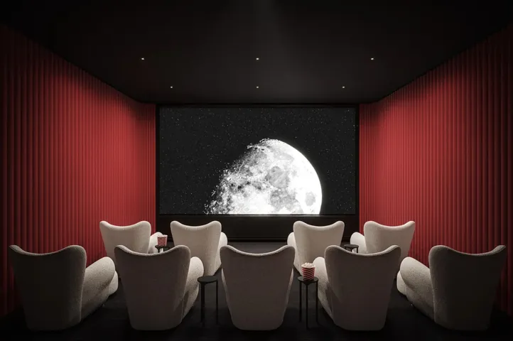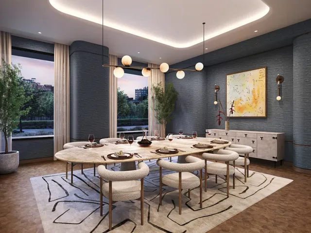 The building’s landscaped porte-cochère opens onto a welcoming, 24-hour attended lobby where residents enjoy access to a full suite of amenities, including co-working lounges with private phone booths and a wet bar, a custom library, children’s playroom, pet grooming, and a private cinema. The hospitality-driven amenities are designed by Ward & Gray.