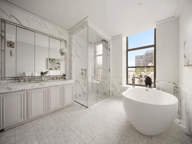 The windowed kitchen features Crema Delicato marble counters, white matte lacquer cabinet by Aster Cucine, and top-of-the-line Gaggenau appliances. The primary bedroom suite boasts two closets, north and east exposures, and a luxurious en-suite bath with Calacatta Gold and Thassos mosaic marble floors, Calacatta Gold slab marble walls and vanity countertop, and Waterworks fixtures including a freestanding oval soaking tub. All secondary bedrooms face north with en-suite baths featuring Bianco Venetino marble vanity tops, tub surrounds or stall showers. The laundry room includes a side-by-side washer/dryer.
