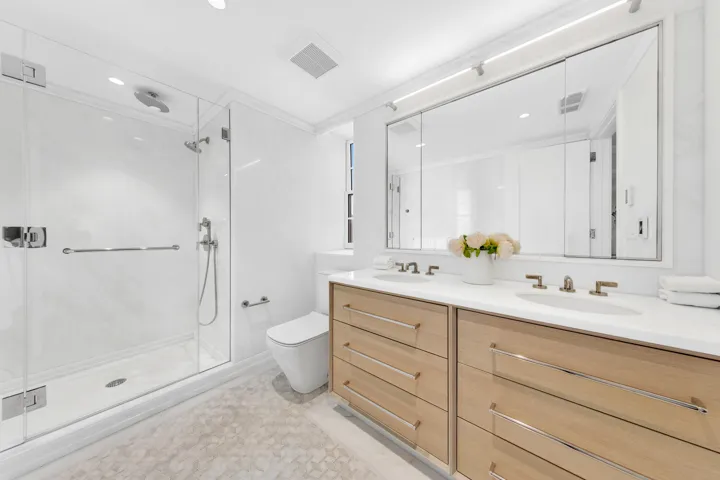 The primary suite is a serene retreat with three oversized windows, and the adjoining en-suite bathroom is an indulgent escape, wrapped in floor-to-ceiling marble with intricate moldings and custom shelving. Heated floors and Kohler fixtures add layers of luxury to a space designed as much for daily comfort as for beauty.
