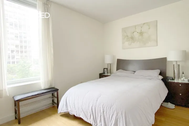 Residence 4N at 303 East 33rd Street offers approximately 747 square feet of modern, corner living with bright south and west exposures. Oversized windows frame treetop views along the 2nd Avenue promenade, while bamboo flooring adds warmth and sophistication throughout. The sleek, open kitchen is outfitted with Bosch appliances, quartz countertops, and contemporary cabinetry, seamlessly integrating form and function. The bathroom features Bianco Dolomiti marble, quartzite tile floors, glass mosaic accents, and premium Kohler and Grohe fixtures. A private storage bin is included with the home, adding everyday convenience.