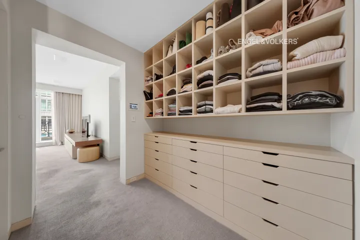 The kitchen is equally customized, featuring satin-finished veined Calacata marble countertops, a custom glass mosaic backsplash, and custom-stained ash cabinetry. Designed with functionality in mind, it includes a discreet pantry and top-tier appliances.