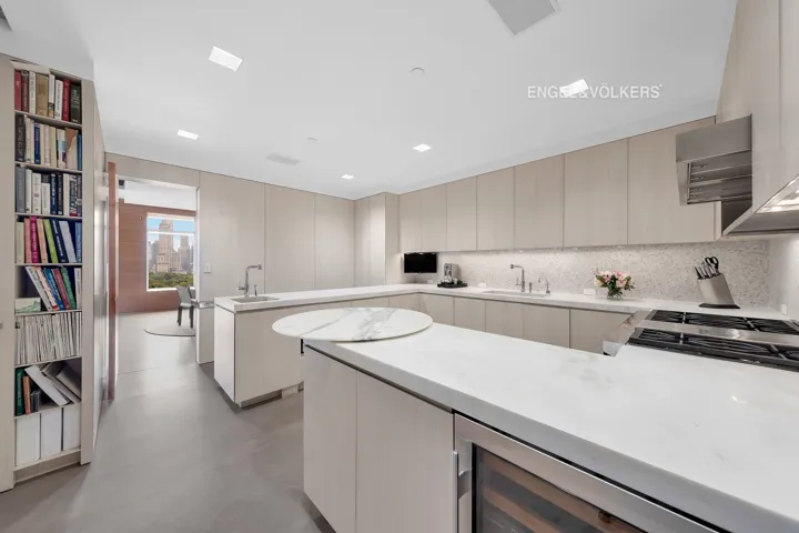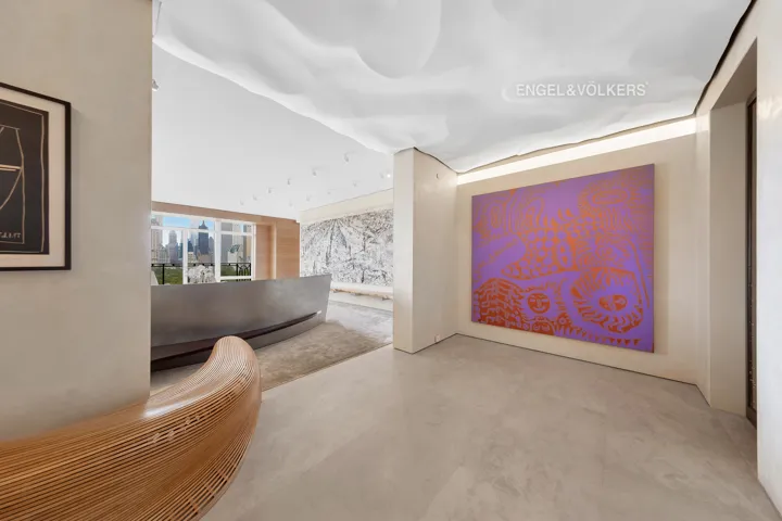 The main living areas are set along Central Park, where the living room, formal dining room, and study flow together effortlessly, ideal for both relaxed living and entertaining. Eucalyptus and walnut millwork, Venetian plaster walls, Edison Price lighting, and Brazilian Ipe shelving in the study create a warm, tailored atmosphere throughout.