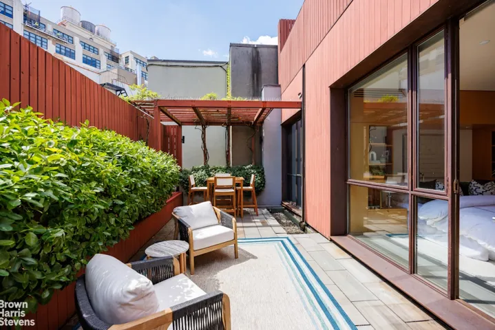 The gorgeous roof deck, accessible from the elevator , boasts fantastic open skyline views, including the Empire State Building and Hudson Yards. The deck includes multiple seating areas, a pergola, and mature landscaping including birch trees.