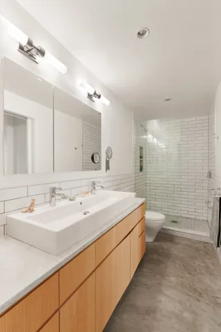 Bathrooms are finished with custom ash millwork, Duravit, Dornbracht, and Hansgrohe fixtures. Comfort is assured with radiant cement floors below, Runtal radiators above, and ducted split-system cooling.