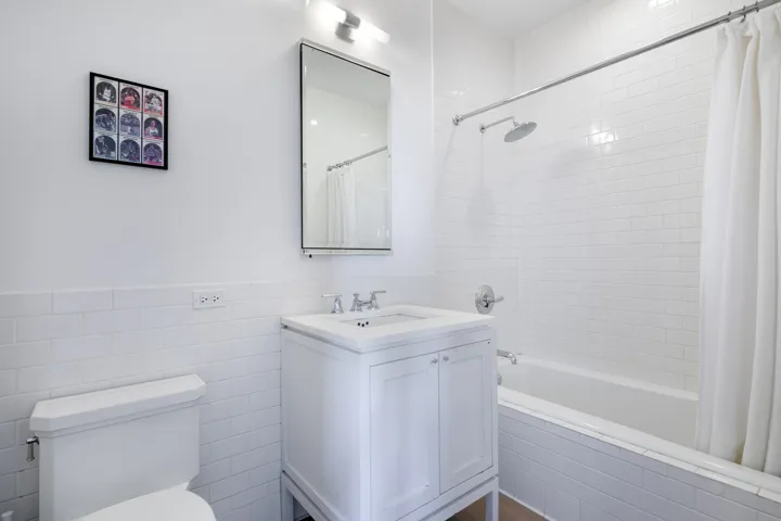 As you enter the home, you’re greeted by a bright and airy open concept living and dining space with lofty ceilings and oversized windows that frame open views of classic brownstone Brooklyn and Fort Greene Park. With ample room for both lounging and entertaining guests, the living area allows for many possibilities to both enjoy and showcase your space. Plus, custom blackout shades give comfort and privacy. A spacious coat closet only adds to the large amount of storage space this apartment affords.