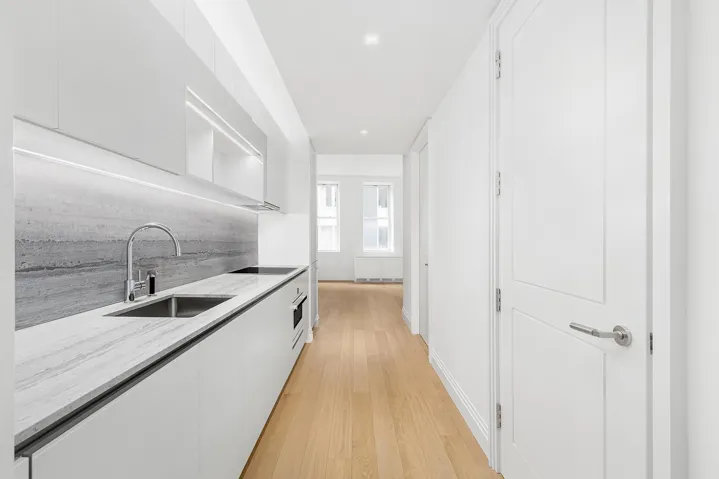 Warm stone primary bathrooms feature large soaking tubs and heated floors. The building’s one-of-a-kind residences maintain the integrity and character of the 1930s scale, a modern take to art deco detailing, and boast ceiling heights over ten feet throughout with wide-plank French Oak hardwood floors underfoot.