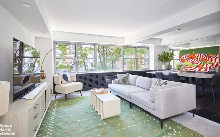 The open living room-dining layout showcases charming views of the surrounding townhouses, mature trees, and verdant gardens through oversized windows spanning 17’6″ of the 21′ width of the space. The delightful views are on display from the moment one enters the apartment-and NYC landmarks like The Carlyle can even be spotted sparkling at night from the living room windows. A gracious entry leads into a large open living room-dining space that can accommodate sizable gatherings while remaining intimate for cozy days and nights at home. The large kitchen, just off the dining area, is ideal for the casual or serious chef, and features a full-size luxury Fisher and Paykel fridge. The generous corner primary bedroom has dual exposure windows with fantastic townhouse/garden/tree views in both directions. It features a full wall of closets, an additional large