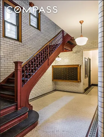 Situated on the top floor of a lovely pre-war coop with elevator, this home features lovely pre-war features like high ceilings, exposed brick walls, decorative fireplace, hardwood floors, and period moldings.