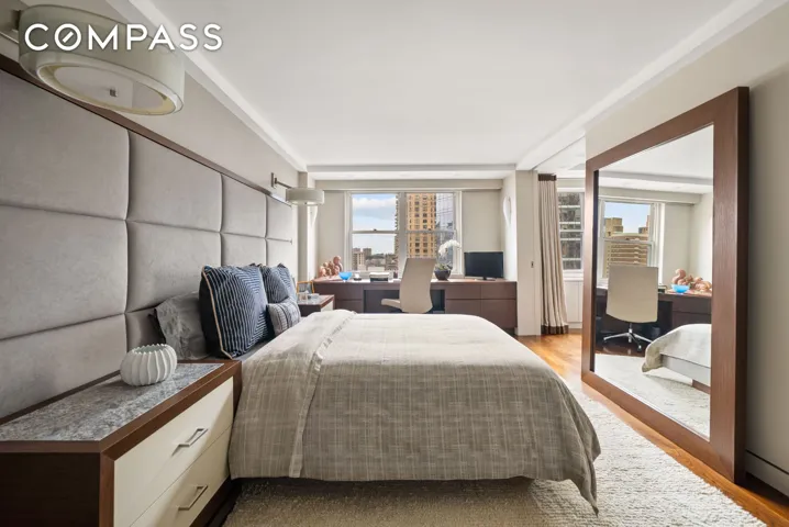 The primary bedroom also enjoys open western exposures, offering the same skyline and river outlooks, along with a custom built-in desk, a large custom-fitted closet with built-ins, and excellent additional storage throughout the apartment.