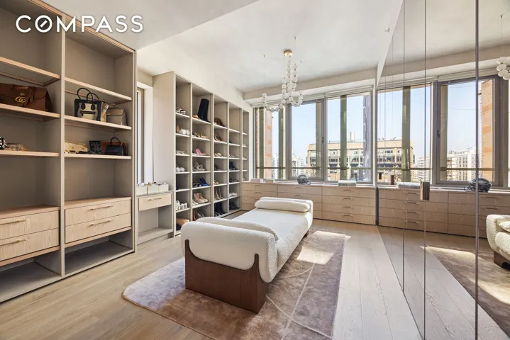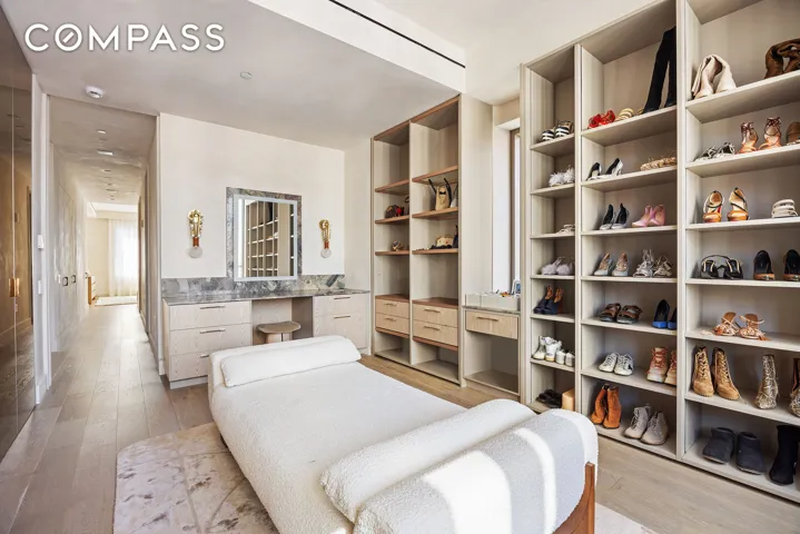 The primary suite includes a fully built-out Ornare closet, leather-wrapped bed, and boucle bench. Custom millwork throughout adds functional storage, including an integrated console in the living room. Every detail has been thoughtfully designed to maximize aesthetic impact and livability.