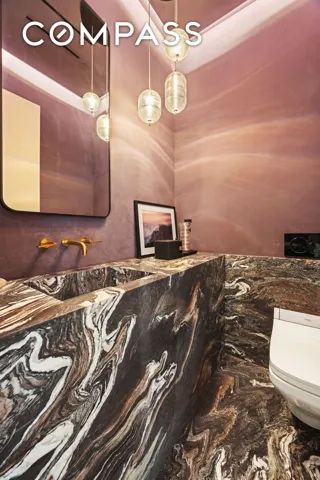 Currently configured as a three-bedroom with three-and-a-half bathrooms, the home was originally planned as a four-bedroom and can be readily converted back to a four-bedroom layout if desired. Wide-plank white oak floors are paired with limewashed walls and ceilings to create a tonal, calming atmosphere. A sculptural plaster fireplace anchors the living space, while the dining area includes a built-in banquette and a custom cocktail bar. The kitchen is finished with Esmeralda quartzite countertops and high-end appliances. The powder room features Cipollino marble, and the entry foyer is defined by a white oak louver wall and a Viola marble vanity.