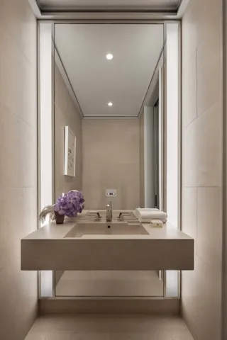 The private primary suite offers north-facing views; an oversized, windowed walk-in closet; and a spacious, windowed en suite bath with radiant heated floors. Elegantly appointed in polished Noir St. Laurent marble, high-honed Verona limestone, and polished Persian golden travertine with polished nickel Dornbracht fixtures throughout, the primary bathroom features a custom carved double vanity, cast iron Lefroy Brooks soaking tub, freestanding shower, private water closet, and dual linen closets. A gracious secondary bedroom enjoys easterly light and offers an en suite bathroom clad in high-honed Verona limestone with polished nickel Dornbracht fixtures. Completing the residence are a beautifully appointed powder room and a discreet utility closet with side-by-side washer and vented dryer. No detail has been overlooked, from the custom interior lighting design by Thierry Despont in collaboration with Schwinghammer, to the motorized Lutron solar shades throughout with additional blackout shades in each bedroom, to the supply of humidified and filtered fresh air throughout the home.