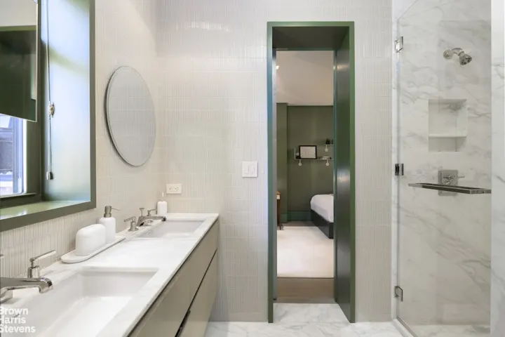 A stunning custom staircase leads to the 9th floor bedroom level, also directly accessible via the building’s 9th floor landing. The massive corner primary suite showcases vistas of the Hudson River from its bedroom and its double-windowed bath. The five-fixture primary bathroom is clad in book-matched Bianco Calacatta marble slab to the ceiling with a large bronze-mounted floating Emerald Onyx double vanity. There is a glass-enclosed rain shower with vistas of the river as well as a deep Zuma Jacuzzi tub. The dressing room is outfitted for even the most extensive of wardrobes. There are four additional bedrooms, each with designer finishes and customized closets. The bathrooms servicing the ancillary bedrooms are finished in Bianco Calacatta marble and cleverly share a large central shower which can easily be divided into two fully separated full bathrooms if preferred. The lower level is rounded out by a large den with a Dolby sound system, a giant cedar walk-in closet and a large windowed laundry room with an industrial-size vented washer/dryer which can be converted to another bathroom if desired.