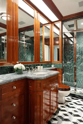 Upstairs, private quarters are serene and expansive. The Primary Suite is a delight, with a Park Avenue-facing Bedroom with a wood-burning fireplace. At 26 feet in length, this room is flooded with morning sunlight and supported by two very ample paneled Dressing Rooms with custom-fitted storage, and two marble bathrooms. There are three additional Bedrooms, each with an ensuite bathroom; two of these have glorious east-facing outlooks over Park Avenue. Completing this level is a separate staff room with an ensuite bathroom.