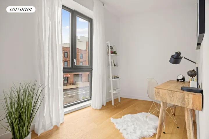 The chef’s kitchen is an entertainer’s dream, outfitted with a Bertazzoni gas range, Fisher & Paykel paneled refrigerator, a built-in wine cooler, and custom cabinetry with sleek, modern finishes. Two generously sized bedrooms include a serene primary suite with double exposure and a spa-like en suite bathroom, while the dedicated home office is perfect for working remotely, a creative studio, or additional guest space.