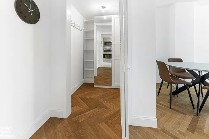 The home opens into a bright and expansive living and dining area, accented by classic herringbone hardwood floors and oversized windows that frame the sweeping New York skyline. Just off the entry, a large walk-in closet provides exceptional storage. The renovated kitchen combines style and practicality with sleek cabinetry, stainless steel appliances, and generous counter space.