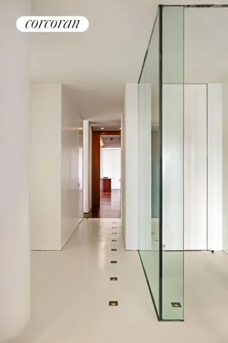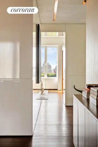 A private elevator landing opens to a glass vestibule, leading into a dramatic twenty-eight-foot gallery that anchors the floor plan and sets the stage for an enfilade of entertaining rooms along Fifth Avenue. The northwest corner living room, with nine oversized windows and a walnut-encased steel fireplace, flows into a luminous library and media room with a second fireplace, and a refined dining room with sandblasted glass walls that filter courtyard light. The eat-in chef’s kitchen, concealed behind a sixteen-foot glass wall, is outfitted with Bulthaup cabinetry, a stainless-steel island, and professional-grade appliances by Sub-Zero, Viking, and Miele. A powder room with park views, concealed storage, and a vented laundry complete this wing.