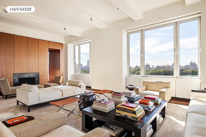 With nearly fifty feet of Fifth Avenue frontage and twenty-five oversized windows across three exposures, this luminous residence frames sweeping vistas of Central Park, the Jacqueline Kennedy Onassis Reservoir, and the Guggenheim Museum. Elevated above the treetops, it enjoys unobstructed northern exposures, permanently protected by the museum directly next door. The interiors are defined by eleven-foot beamed ceilings, white lacquer finishes, custom white resin and black wenge-wood floors, and two wood-burning fireplaces.
