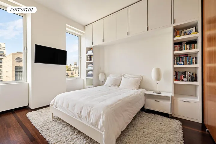 The private quarters include a primary suite accessed through a walnut-paneled corridor with ten custom closets. With open park views, this retreat features a spa-quality bath with Dornbracht fixtures, radiant heated floors, a deep soaking tub, and a steam rainfall shower with dual heads. All three bedrooms face north, with open exposures overlooking Central Park and the Guggenheim Museum, ensuring exceptional light, privacy, and views. A flexible fourth bedroom with a Murphy bed and en-suite bath completes the layout.