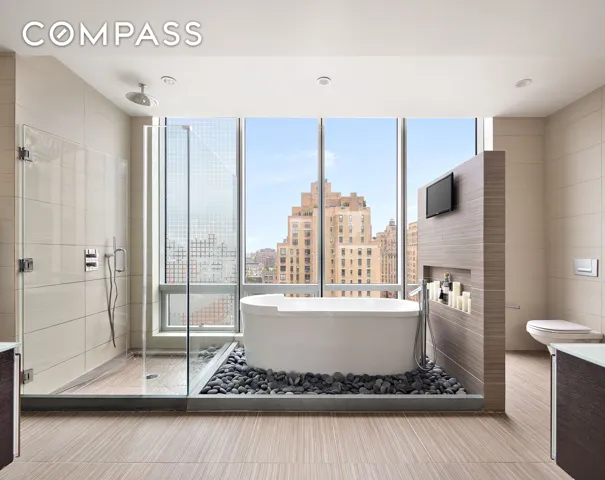 A dramatic stairway leads you up to the second level. All levels are easily accessed with the two building elevators. The mid level houses two bedroom suites both with floor-to-ceiling windows that celebrate the f city views beyond. The primary bedroom suite is grand, accented with customized automatic Roman Shades, a leather padded accent wall and an abundance of custom closets. The ensuite bathroom rivals the world’s great Spas with a deep soaking tub surrounded by Zen pebble stones as a centerpiece: a wall of windows acts as the backdrop with southern views all the way down to the World Trade Center. This bathroom is finished with double Valcucine vanities and Duravit sinks, Grohe faucets and fixtures, a separate shower and automated shades. The 2nd bedroom suite has custom mill work and a wall of windows to the North and West.