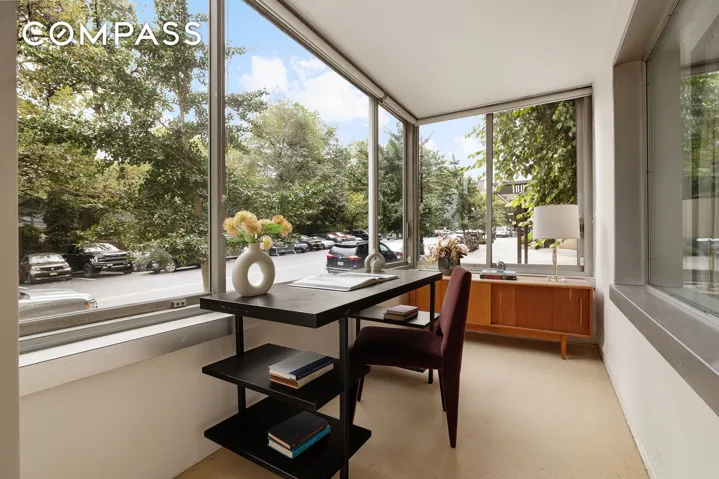 co-op building with dining area, enclosed terrace and direct views of Carl Schurz Park and the grounds of Gracie Mansion.