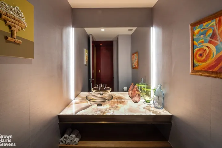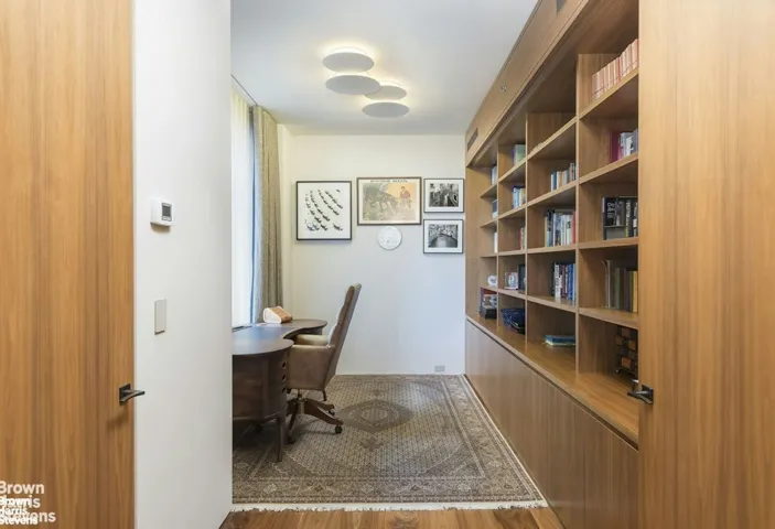 Two bedrooms and a sitting room, easily able to be converted back to a third bedroom, have been thoughtfully tucked away in the east wing of this impressive residence. The primary bedroom occupies the prime east-facing corner, allowing for double exposures and treetop views of Central Park. The sitting room is connected to the primary bedroom with full-height solid walnut doors and is currently configured as a home office bedecked with built-in walnut cabinetry and shelving. Completing this all-encompassing primary suite is the primary bathroom outfitted in Ivory and Persian Sunset Travertine with a walnut clad vanity, reminiscent of the colors and textures found in nature to provide a serene at home spa experience. An oversized soaking tub sits picturesquely under a Park facing window while a glass encased spa shower with dual shower heads is tucked off to the side. Radiant heated floors and heated towel racks complete this space.