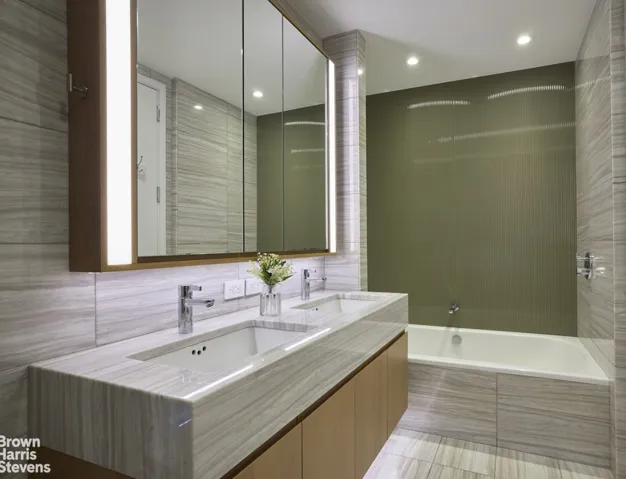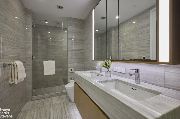 The sponsor seamlessly combined two apartments to offer a rare and versatile layout of 5BR with endless views and 6BA with luxurious marble finishes. The sleek open chef’s kitchen boasts 2 Subzero refrigerators, stainless steel appliances plus a huge walk in pantry. All windows have Lutron controlled shades while a 5 zone Nest air conditioning system keeps the apartment at the perfect temperature. Included are two sets of industrial sized W/D’s that vent outside. Wide Plank oak flooring and endless custom closets throughout make this home luxuriously comfortable and spacious. The primary suite is separate from the other bedrooms, ensuring privacy and boasts multiple walk in custom closet solutions. All the bedrooms are sunny with bright, open views. Make this your sanctuary in the sky!