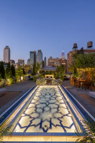 The penthouse’s private gardens are nothing short of extraordinary. Landscaped with intimate seating alcoves, a tranquil reflective pool, and sweeping vistas of the NY skyline & Empire State Building, they offer a rare opportunity to live amid nature and water in the heart of Manhattan’s cultural epicenter.