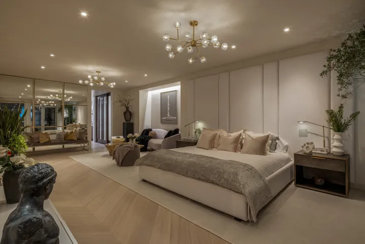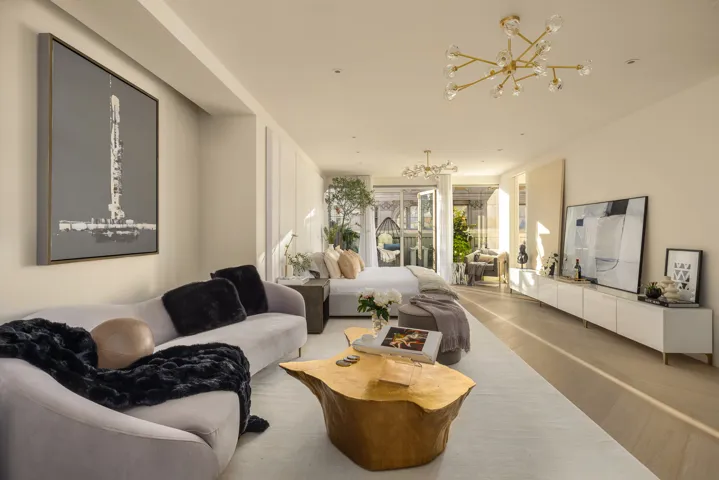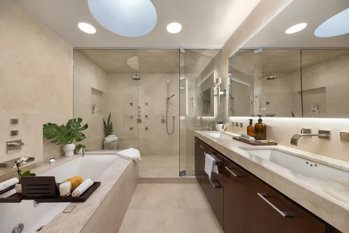The primary suite rests in its own private wing, framed by custom Sapele Pommele wood doors and designed as a retreat within the retreat. The expansive chamber includes a dedicated living area, lounge seating, a sumptuous dressing area, and a grand 12-by-9-foot walk-in closet. A wraparound terrace connects seamlessly to this sanctuary, while the spa-inspired primary bath offers an oversized steam shower, radiant-heated floors, a deep spa jacuzzi, dual vanities, and a dramatic dome skylight, clad in Taj Mahal and Crema Marfil marble with Dornbracht fixtures, enveloping its owner in serene luxury.