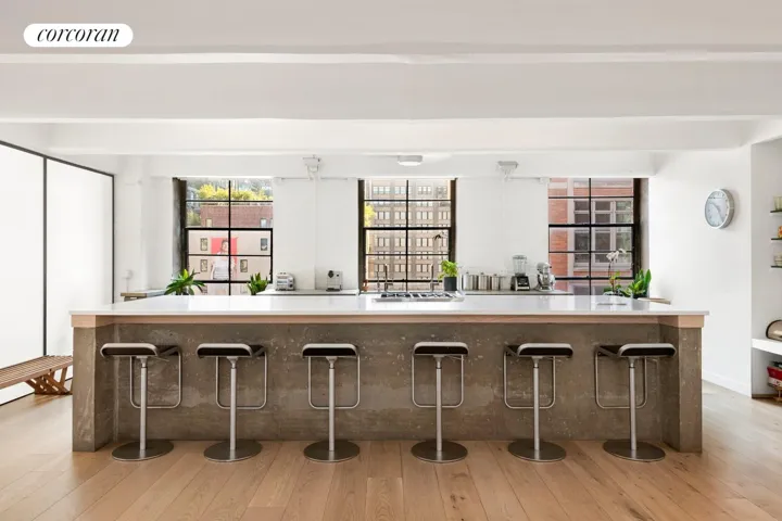 Keyed elevator entry welcomes you inside the 3,000-square-foot residence, where tall beamed ceilings, pale wide-plank hardwood, crisp white walls, and oversized casement windows on three exposures deliver a sun-kissed, airy ambiance and a pristine backdrop for contemporary living. The gracious foyer is flanked by a walk-in closet and a windowed home office, nodding to the smart layout found throughout. Ahead, the 36-foot-long great room delivers a massive footprint for seating, dining and media lounge areas surrounded by lovely cove lighting, designer pendants and built-ins. A sliding steel door acts as a distinctive focal point that reinforces the building’s industrial past while providing convenient concealed storage. The open layout flows seamlessly to the open gourmet kitchen anchored by a huge marble island/breakfast bar with seating for six. Chefs will love the open-sky views, sleek cabinetry, cast concrete counters, double farm sink, and upscale stainless steel appliances, including Sub-Zero under-cabinet freezers and refrigerators, a Viking range, and dishwasher.