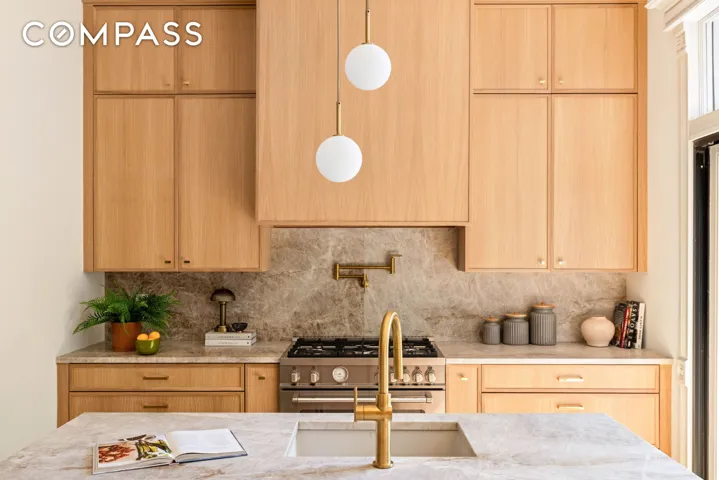 A spacious foyer with double doors opens into the sunlit parlor floor, where an open layout seamlessly balances elegance and function. At the front, the formal living room—anchored by a restored wood-burning fireplace and original stained-glass accents—sets the tone for refined entertaining. The central dining area is complemented by a well-appointed powder room, while the rear reveals a chef’s kitchen designed for both style and performance. Outfitted with Bertazzoni appliances, including a five-burner range, French Door refrigerator, wine cooler, pot filler, and dishwasher, the kitchen features custom cabinetry, marble countertops, and a generous island. Double doors extend the living space outdoors to a private deck and expansive backyard, ideal for year-round gatherings.