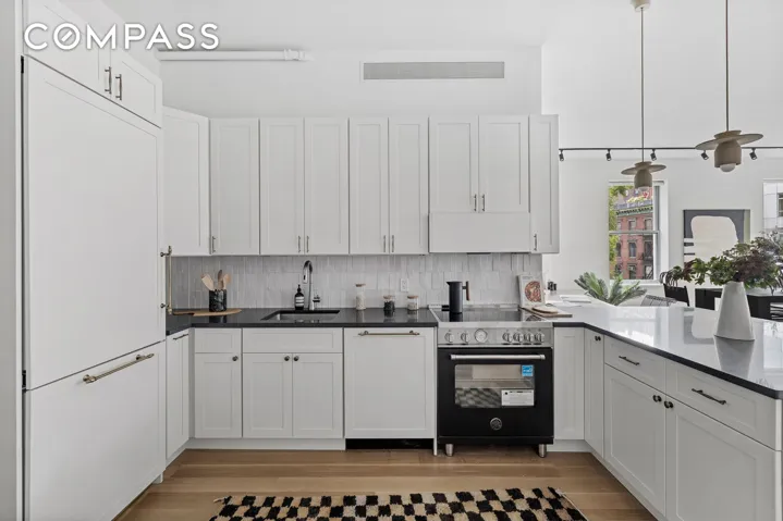 The open chef’s kitchen is outfitted with custom cabinetry, top-of-the-line appliances, and a large breakfast bar—perfect for casual dining or hosting friends with ease.