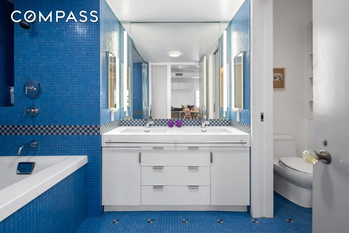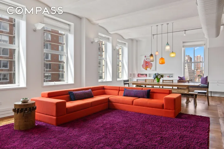 Encompassing the whole west side of the seventh floor, the spectacular floor-through 7AB has southern, western and northern views, gloriously enhanced by seventeen new, oversized, triple-pane acoustic, tilt-and-turn windows custom made by Skyline. Complete with the open sky are views of the Freedom Tower and Hudson Yards.