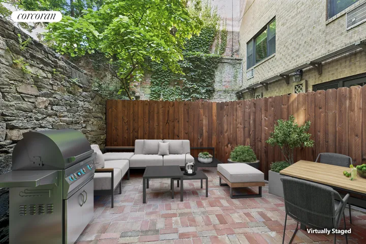 Indoor-outdoor flow in a Manhattan home? The lower level presents an open concept kitchen featuring a chic center island and state-of-the-art appliances, optimal for culinary enthusiasts. Stream seamlessly past the half bath and dining area into the living room and the private courtyard beyond. Hardwood floors, exposed brick and ample storage space further elevate the apartment’s appeal, while the in-unit washer/dryer adds to the contemporary comforts.