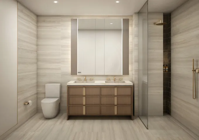 A private vestibule leads to the primary suite, a tranquil retreat with walk-in closet and en-suite bath featuring a custom White Oak dual vanity with integrated lighting, quartzite countertops, Brizo Luxe Gold fixtures, radiant heated floors, and glass-enclosed rain shower. A secondary bedroom and full bath, along with a versatile den or home office, complete the considered layout.