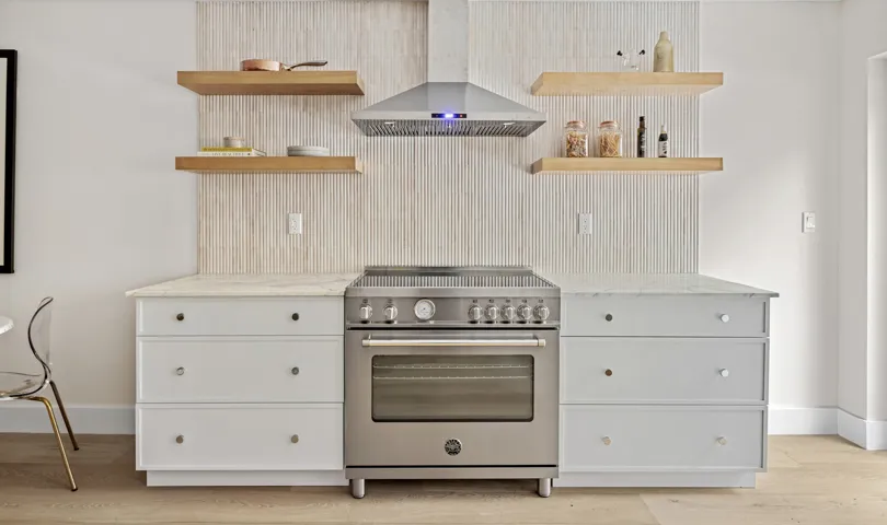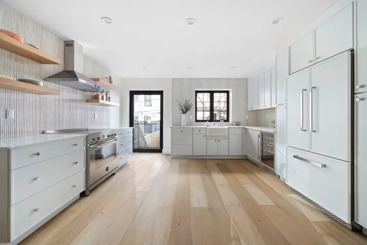 The great room extends the entire depth of the house, where a sitting area, dining area and living area all flow seamlessly into the expansive wrap around kitchen. The kitchen has access to and overlooks the garden. The classically beautiful honed Calacatta Mezza Macchia stone countertops compliment the integrated appliance suite by Fisher & Paykel and a Bertazzoni Master Series oven paired with a powerful overhead vented hood.