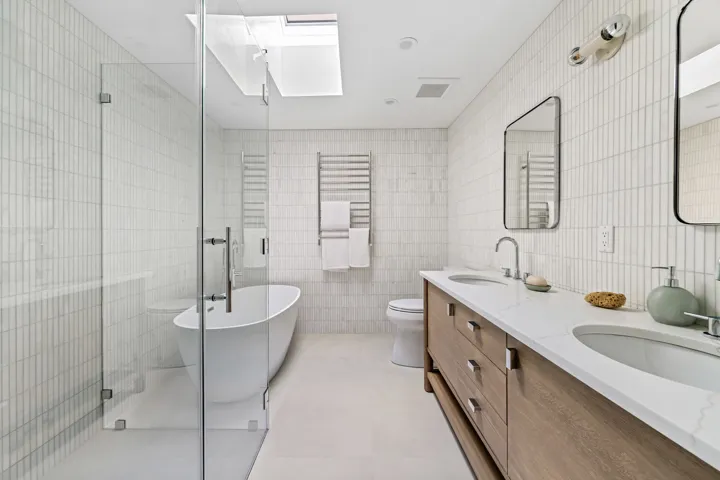This 3-bedroom, 3.5 bath home spans 3,072 square feet. As you enter, you’re greeted by a spacious and open living area with beautiful wide-plank oak flooring. Acoustic oak slat wall panels provide a stylish touch and help create a serene, sound-reduced atmosphere throughout. Built-in ceiling speakers offer Bluetooth controls for each floor.