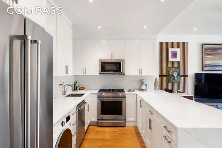 The chef’s kitchen is fully renovated with sleek cabinetry, stainless steel appliances, and thoughtful details, while the spa-like bathroom features a deep soaking tub, heated floors, and a modern design. A convenient in-unit washer/dryer combo adds to the home’s comfort and ease.