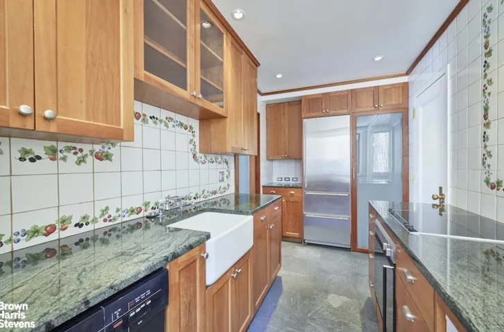 Throughout the apartment is pietra cardosa flooring and custom cherry wood millwork, including a built-in desk for home office work.